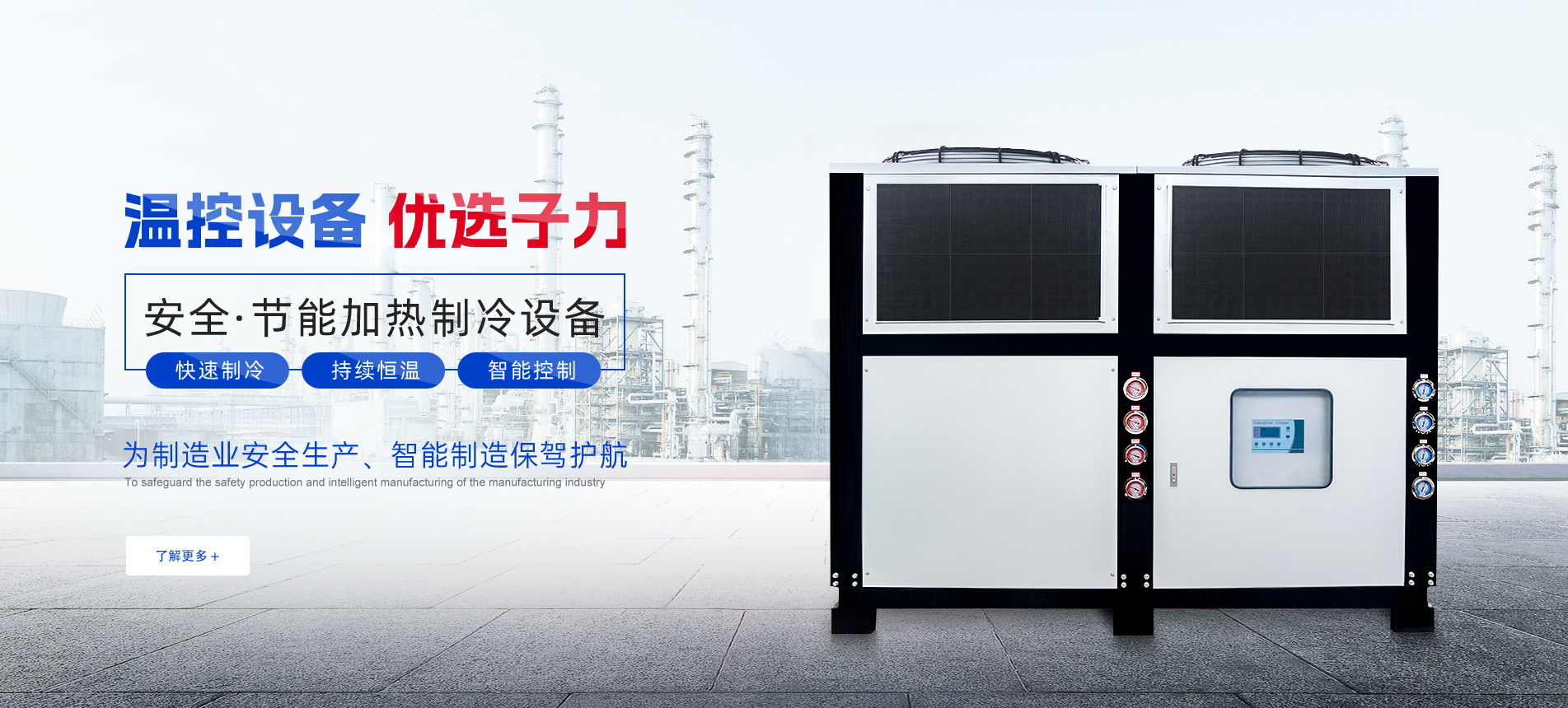 我們擁有先進的生產設備、優秀的產品質量、誠信的經營理念,在塑料機械、制冷、 機電自動化方面有著豐富經驗的研發和生產的專業團隊,在國內溫控設備制造行業 享有很高的聲譽。
